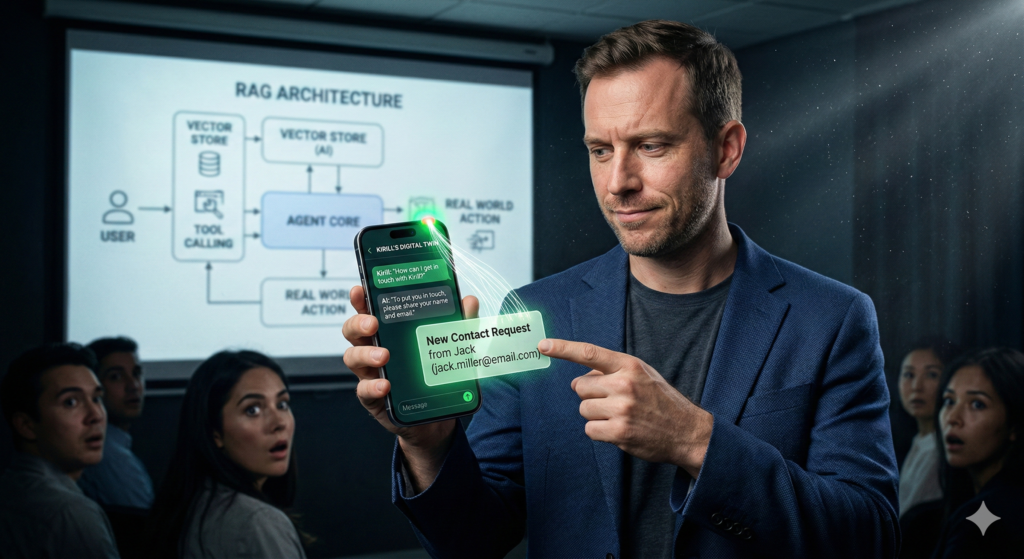 Then I typed: “How can I get in touch with Kirill?” The AI asked for a name and email. I entered a fake name — Jack.