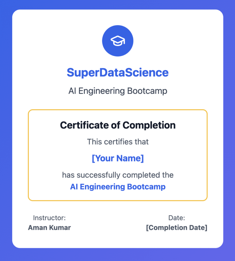 SuperDataScience certificates are recognized by employers worldwide and showcase your AI engineering skills.